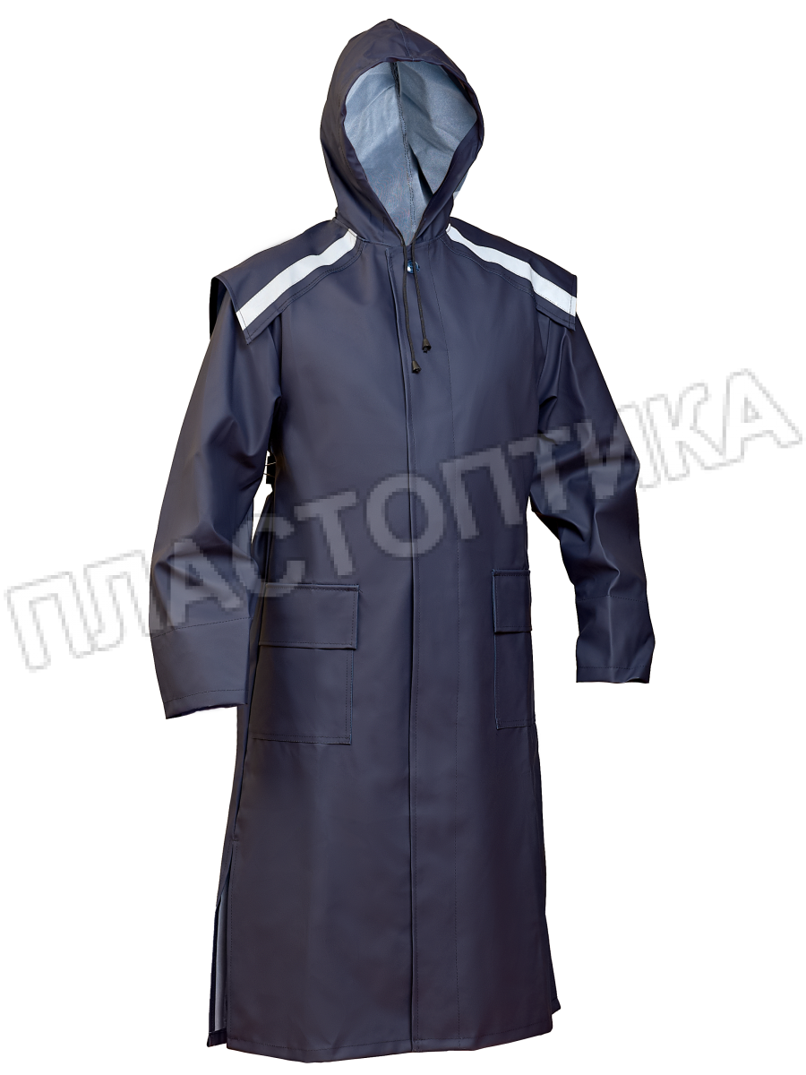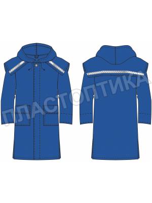 Плащ предназначен для использования на открытых площадках при неблагоприятных климатических условиях. Плащ с центральной потайной застежкой на пуговицы и одной сквозной петлей вверху. Притачной капюшон по лицевому вырезу стягивается шнуром. Два внешних боковых накладных кармана с клапанами на липучку. Спинка без шва, с накладной отлетной кокеткой, переходящей на полочки в виде наплечников. Рукава одношовные, под рукавами и по верхней части спинки изготовлены вентиляционные отверстия для воздухообмена. Световозвращающая лента по переду и спине 25 мм.