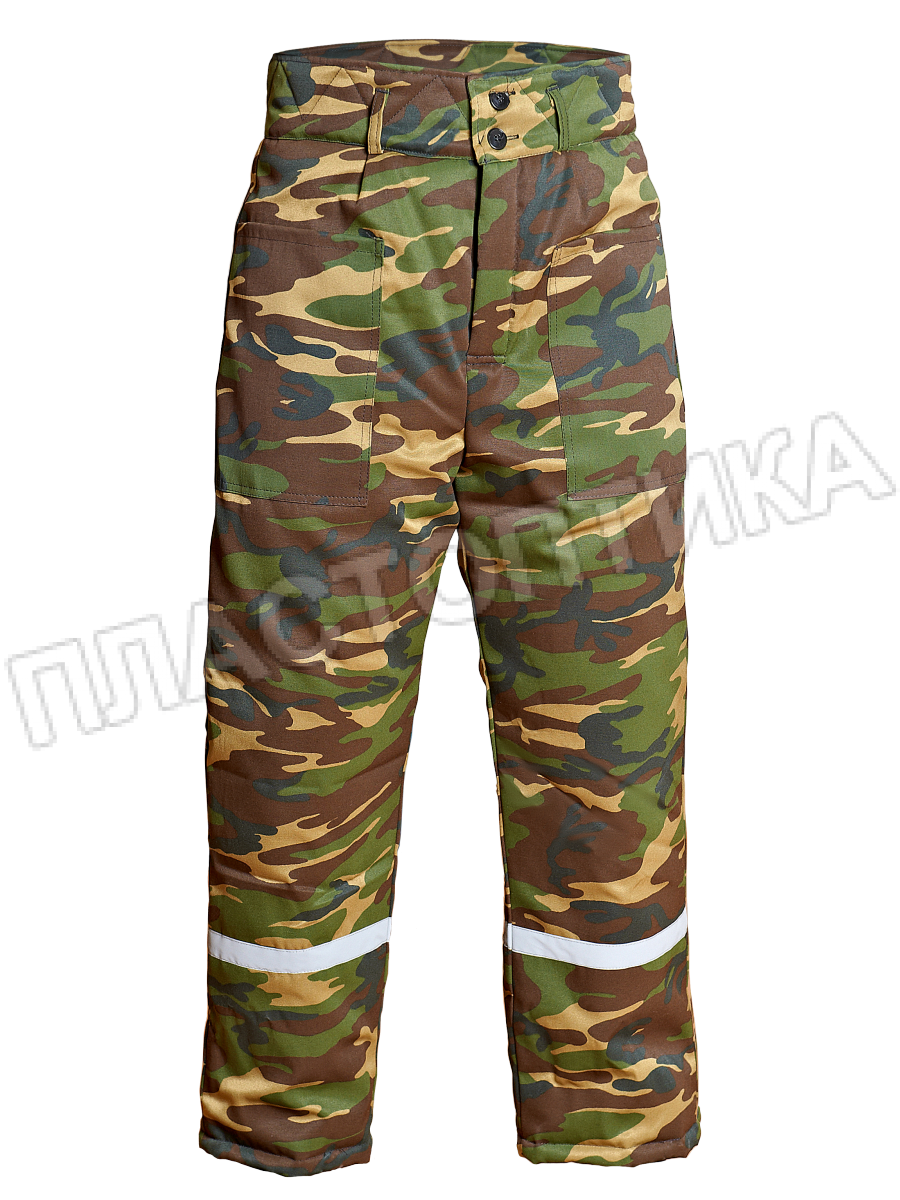 Брюки с притачным расширенным утепленным поясом, накладными карманами на передних половинках брюк. Брюки выполнены с притачной утепляющей подкладкой. По низу брюк настрочена светоотражающая лента.