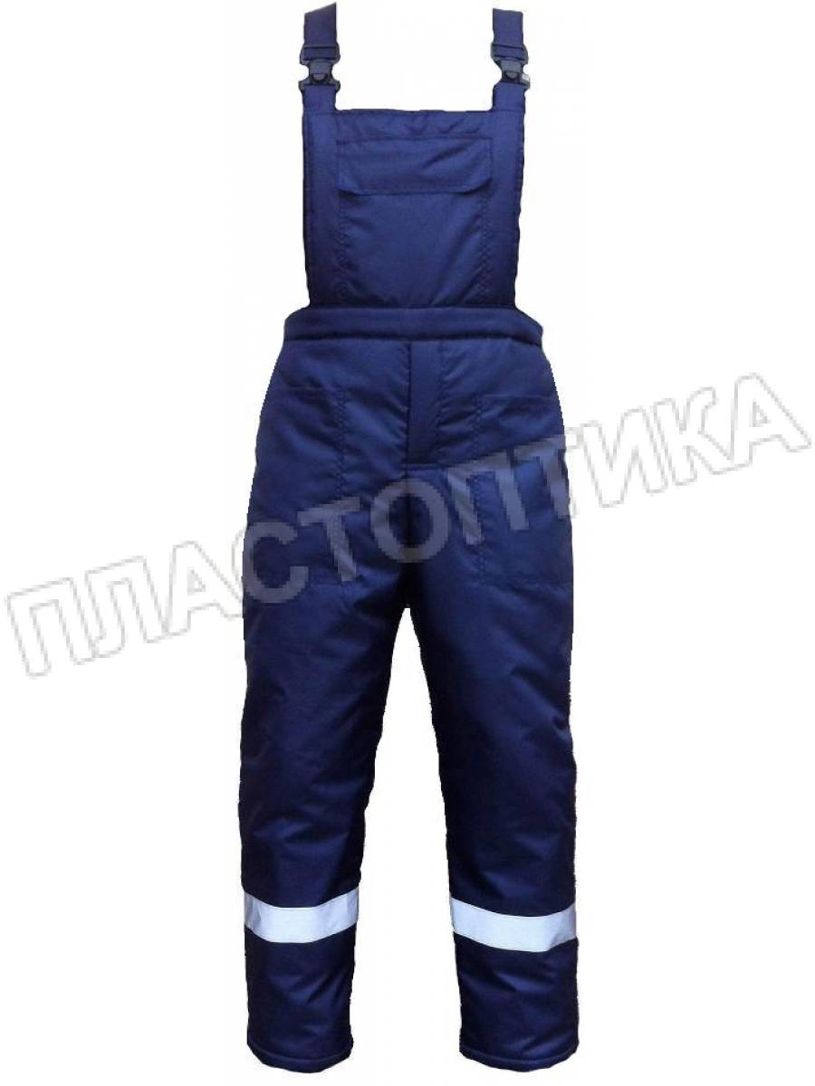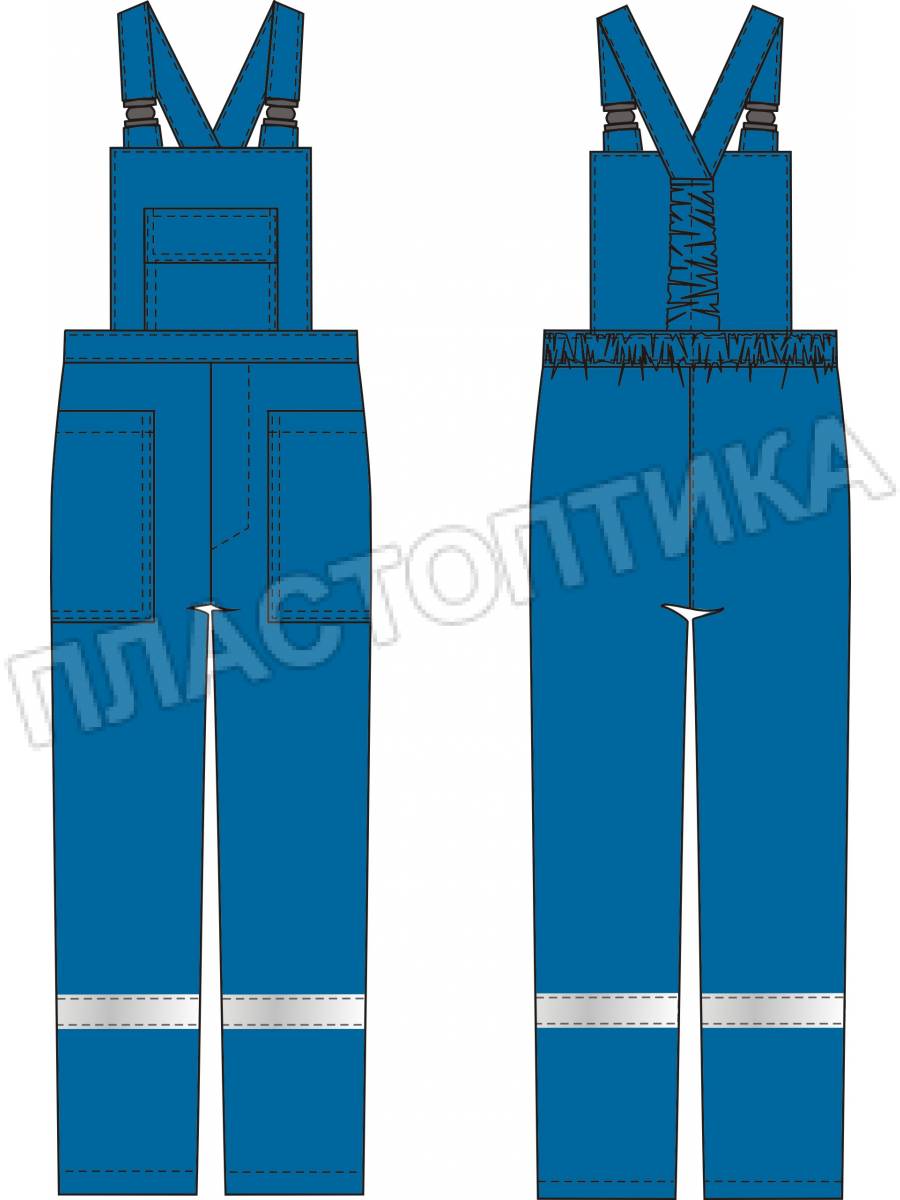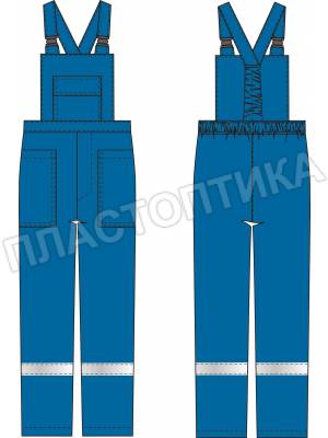 Полукомбинезон: передняя часть отрезная по талии, с застежкой – гульфиком на петли и пуговицы, и с застежкой в боковом шве на петли и пуговицы. На грудку настрочен накладной карман с клапаном. Два боковых накладных кармана. Спинка стянута эластичной лентой. В бретели со стороны спинки вставлена эластичная лента, к нагруднику пристегиваются с помощью пряжек-карабинов. По низу брюк настрочена светоотражающая лента шириной 50 мм.